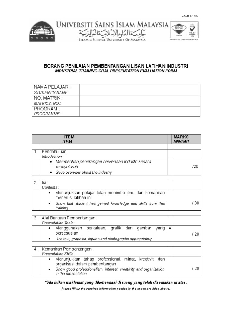 Usim Li B6 Borang Penilaian Pembentangan Lisan Pelajar Pdf